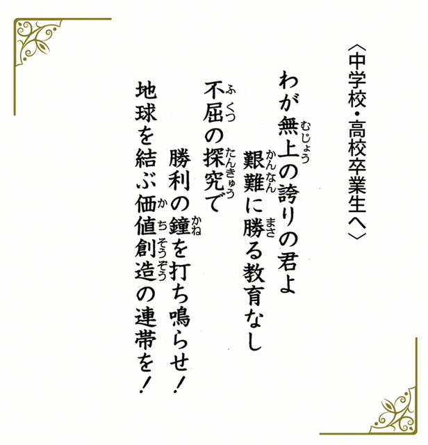 創立者の池田先生はメッセージを寄せ、今年度の卒業予定者には卒業指針を贈った。