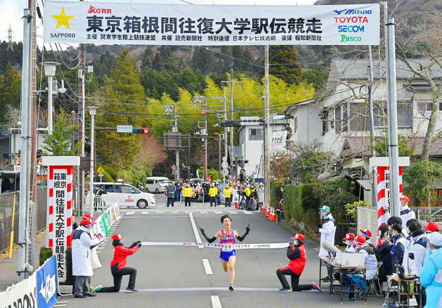 焦らずに走ることを意識し、首位を独走。終盤の下り坂は「脚が動かなくなるくらい、つらかった」と振り返るが、最後まで力強い走りを見せ、史上19校目となる「往路優勝」のゴールテープを切った。