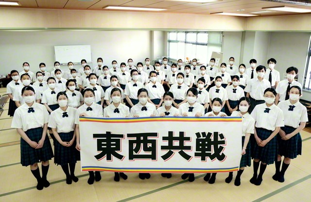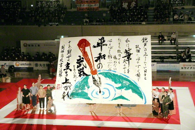 大会当日、部長の野田明佳里さん(3年)は、全出場校を代表し、はつらつと選手宣誓をした。その中の言葉に「闇が深ければ深いほど、暁は近い」と。学園生が書いた「平和」の文字には、苦難をものともせず、前に進み続ける友の信念が光っている。