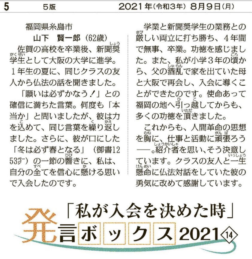 これからも、人間革命の思想を胸に、仕事と活動に頑張ろう――。紹介者を思い、そう決意しています。クラスの友人と一生懸命に仏法対話をしていた彼の勇気に改めて感謝しています。