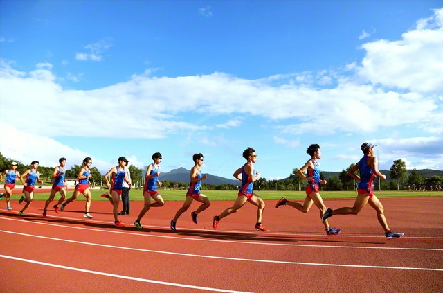 3日午後のポイント練習。菅平高原スポーツランド陸上競技場で、10人前後の四つの集団によるインターバル走が実施された。一定の速さで400メートルトラック1周のランニングと半周のジョギングを交互に繰り返す、厳しい練習だ。