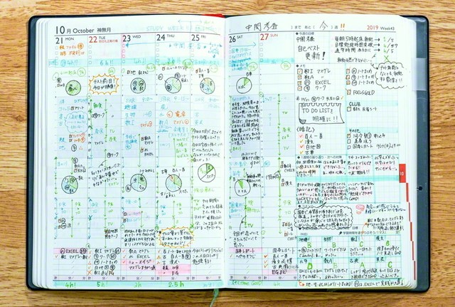 以来、深瀬さんも手帳を使い込み、「時間を大切にできる」ように。特に往復で3時間かかる通学では、いつもならスマホをいじったり、寝てしまったりしていたが、有効に使おうと考えた。通学中に何をしたのか、手帳に円グラフを書き、「見える化」してみた。