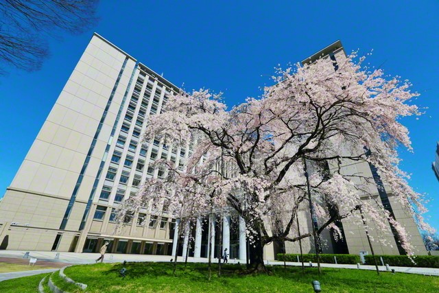 躍動の春。中央教育棟と創大桜。半世紀前、創立者が植樹した苗木は、風雪に耐え、大樹となって咲き誇る。「負けじ魂」を忘れるなと語り掛けるように