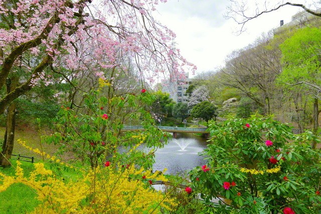 桜にレンギョウ、百花が競演。文学の池は、すがすがしい新生の息吹に満ちて