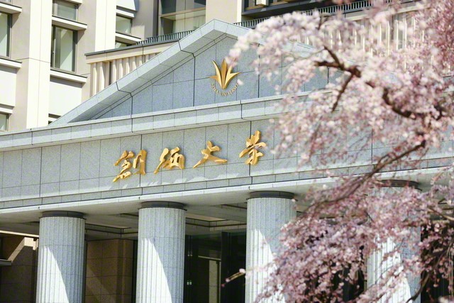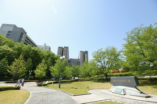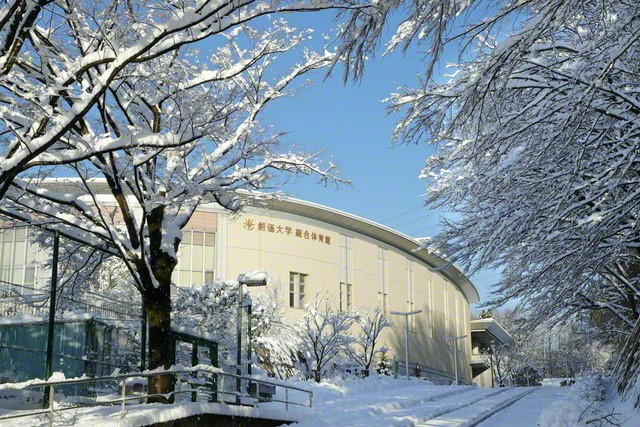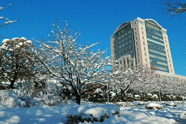 白雪の冬。世界市民のキャンパスがきらめく。青天に厳と立つ本部棟(冬の写真は2018年)