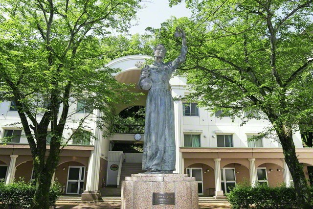 緑光る夏。創価女子短期大学のマリー・キュリー像が気高く。創立者は彼女の姿を通し「どんな人でも、どんな時代に生きても、その人には、その人にしかできない使命があります」「『自分らしく』輝くのです」と短大生に呼び掛けた