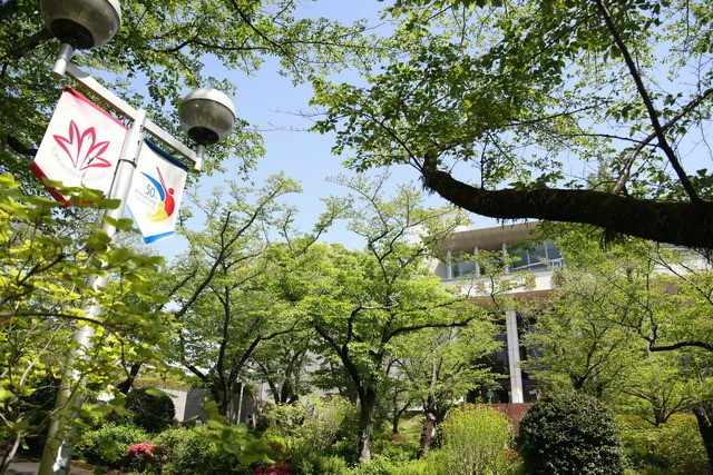 生い茂る青葉。向学の友を迎える中央図書館。創立者は2004年に図書館を訪れた際、「読書は黄金の輝き」「読書は勝利者の源泉」「読書は幸福の伴侶なり」との言葉を贈った