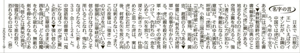 日本で「百獣の王」といえばライオンだが、お隣の中国では虎だという。今年の干支である「寅」は「寅虎」とも書く▼春秋戦国時代の思想書『韓非子』が出典のことわざに「虎に翼」がある。地走るものの王たる虎に空飛ぶ翼を与えると、強い者にさらに力が加わって天下無敵になるという意味だ。それゆえ勇猛な将軍は「虎将」と称された。小説『三国志演義』で「五虎将軍」と呼ばれたのは関羽、張飛、馬超、黄忠、趙雲の5人である▼御書には、有名な「石虎将軍」の故事が引かれている。虎に親を殺された将軍・李広が、その虎を見つけて、仇討ちの一念を込めて一矢を放つ。矢は深々と刺さったが、仕留めたと思った虎は、実は虎に似た石だった。その後、何度も矢を放つが再びは刺さらない。つまり、この故事は「強き一念」の大切さを示している▼御聖訓に「法華経の剣は、信心のけなげなる人こそ用いることなれ。鬼にかなぼうたるべし」(新1633・全1124)と。中国語版の御書では「鬼にかなぼう」が「虎に翼」と訳される▼強い信心の人が、法華経のままに実践を貫けば、どんな障魔をも打ち破れる。無敵の剣を得たようなものである。信心とは勇気の異名。強盛な祈りで進む限り、恐れるものはない。(恭)
