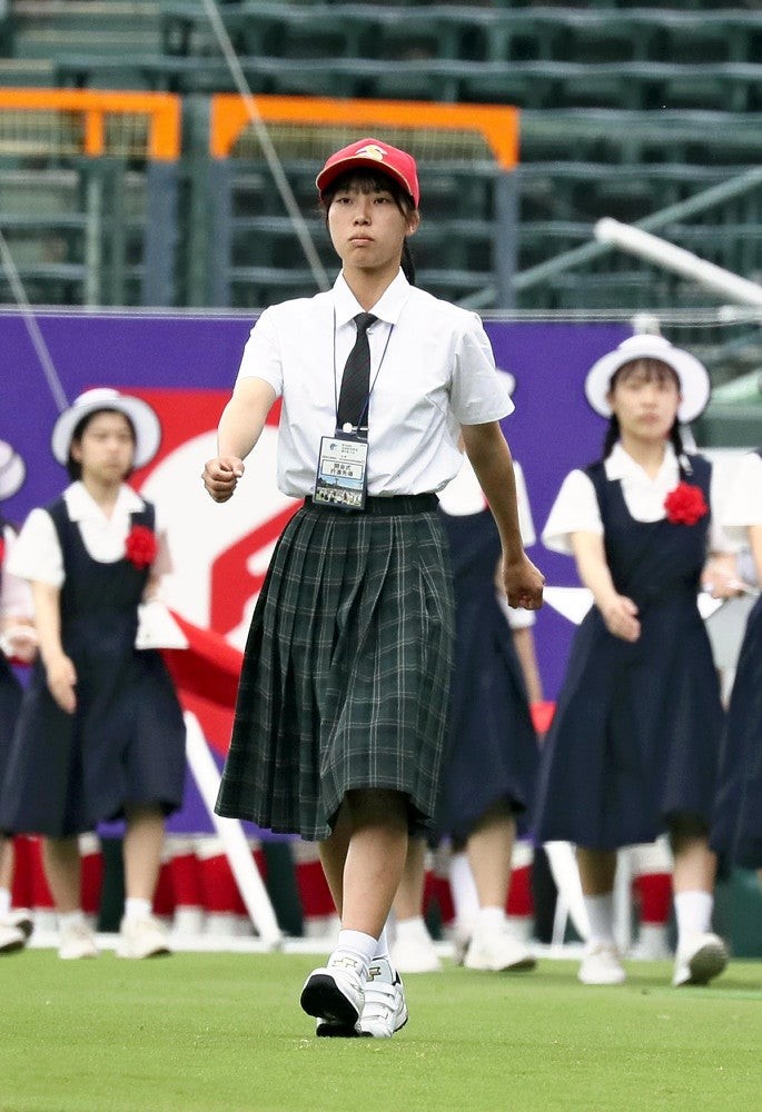 開会式のリハーサルで、入場行進の先導役を務める東尾凜さん(5日午前、兵庫県西宮市の甲子園球場で)=守屋由子撮影