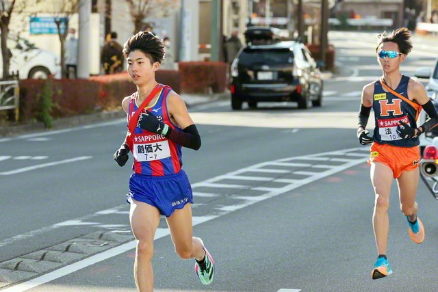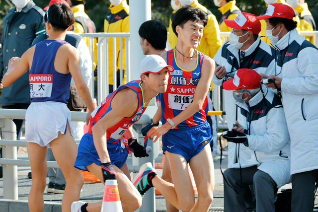 苦楽を共にした同期から最高の形でタスキを受けた7区の葛西選手。出走前、「区間新と区間賞を狙います」と語った創価のエースは、区間記録を上回るハイペースでレースに入り、3キロ手前で順位を5位へ押し上げる。