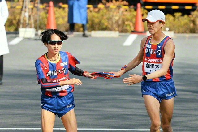 落ち着いたリズムで前を追うが、15キロ過ぎで足がつり、苦しい展開に。それでも最後は足を叩きながら執念で走り切り、6位で戸塚中継所へ。桑田選手は創大の8区最高記録(前々回)を3秒更新するタイムをマーク。3位と15秒差まで詰める好走だった。
