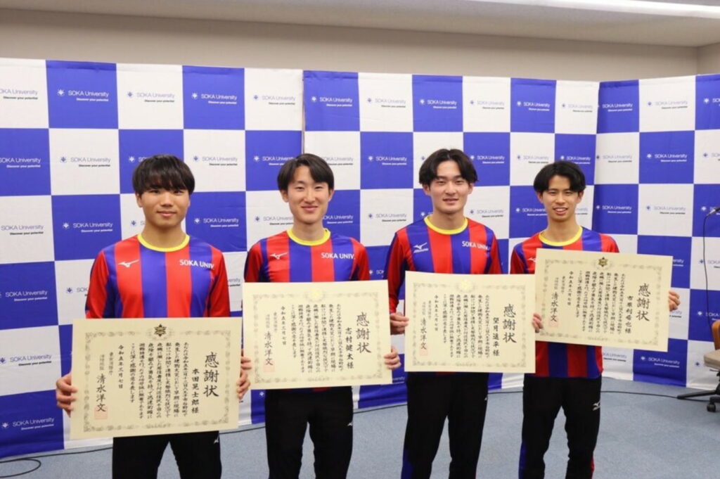 感謝状が贈られたのは市原利希也(4年)、葛西潤(4年)、本田晃士郎(4年)、志村健太(3年)、望月遥平(3年)と、駅伝部員とともに救助にあたった同大在籍の吉本有芽さんに贈られた。