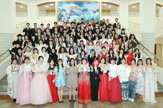 国際性・多様性・独創性・人間性に満ちた、平和の学府から巣立つ皆さんは、世の分断や対立の闇を打ち破る、聡明にして快活、誠実にして強靱なる価値創造の生命の光を、昇りゆく旭日のごとく放っていってください。そして、いずこにも希望と信頼の花咲く大道を、負けじ魂朗らかに開いていただきたいのであります。