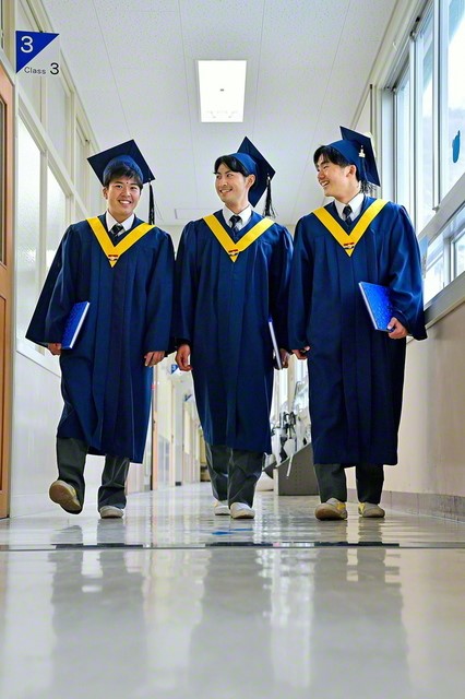 ガウンを身にまとい卒業式の会場に向かう廣田さん㊥、崎坂さん㊧、橘さん。廣田さんは「野球部の同期20人は家族のような存在」と